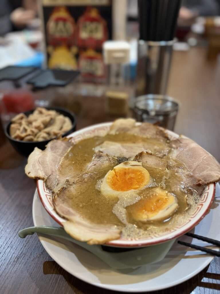 だるまチャーシューともつまんまを注文し、18時5分に着丼。
