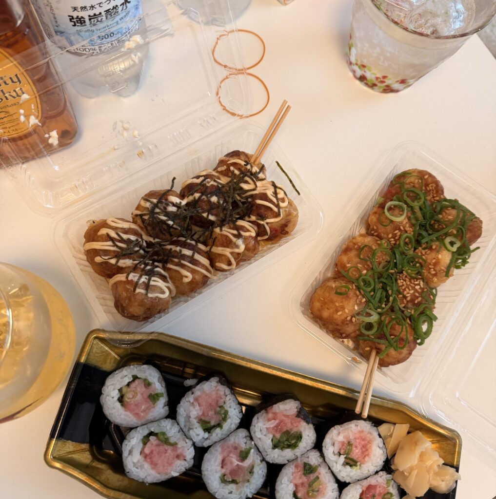 評判の高いたこ焼き屋さんのたこ焼きと、友達が用意してくれたネギトロ巻き(酔っぱらって買ったらしい)で早速乾杯🍻