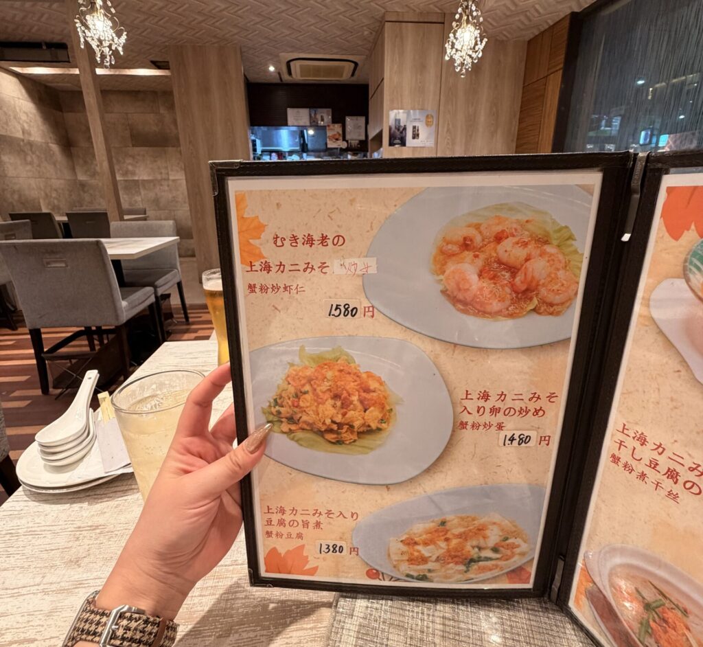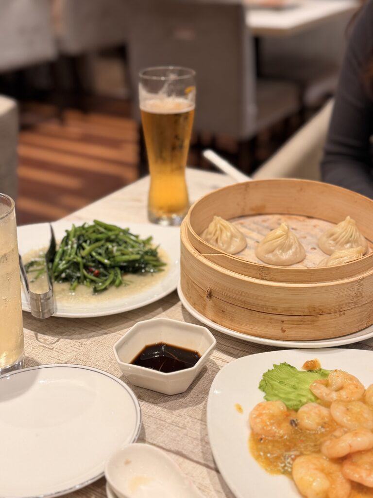 ちょうど上海蟹のフェアをやっていたので「むき海老の上海カニみそ炒め」と「白金豚小籠包」「空心菜ニンニク炒め」「担々麺ハーフサイズ」を注文( ◠‿◠ ) ♬