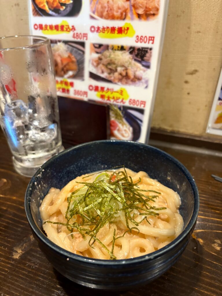 前回食べておいしかった明太うどんを注文!2杯飲んで1人約1,000円!