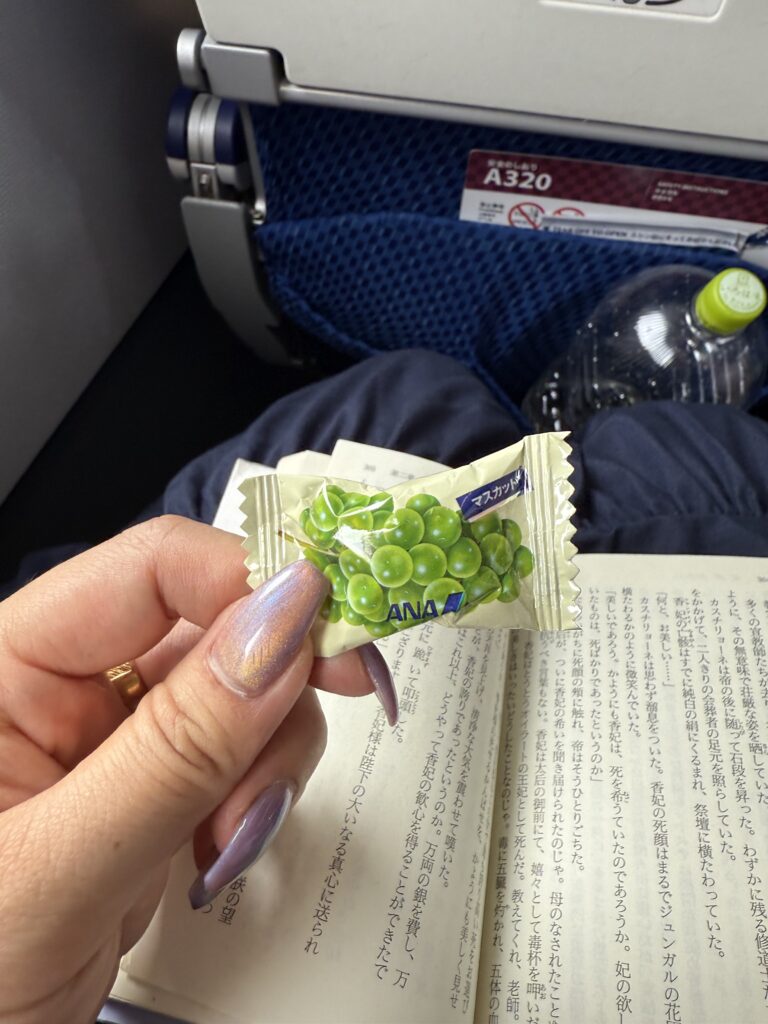 この日は台風で、機内がとっても揺れて飲み物がでず、飴をいただきました。