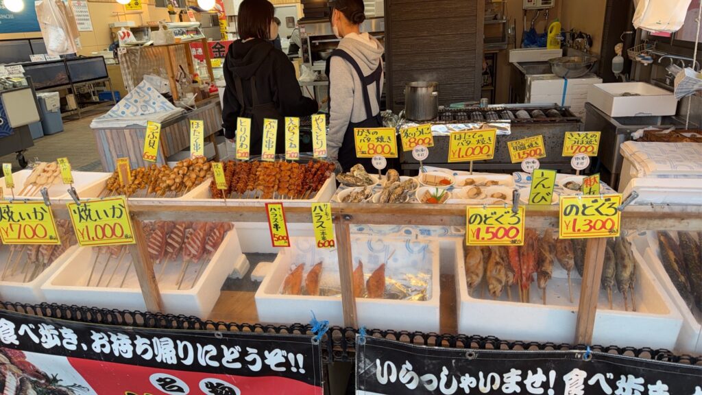 わたしたちは店頭で浜焼きを提供している金八で軽く食べることに。