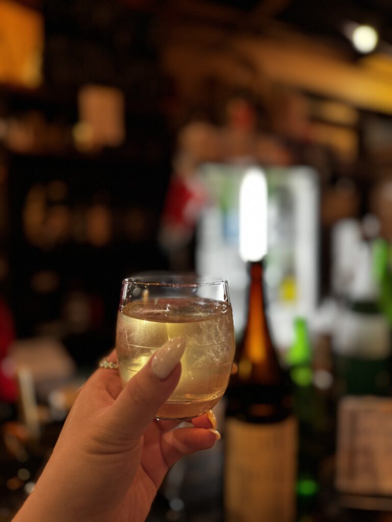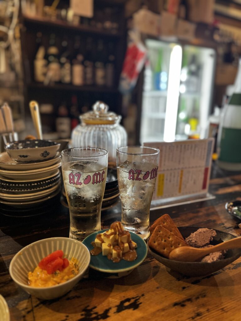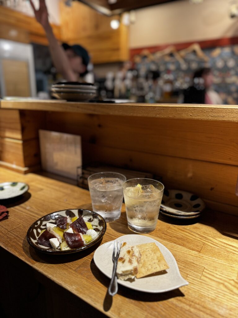 立ち飲み屋さんですがお酒もしゃれたものが多く、日本酒や自家製カルダモン焼酎もいただきました✨一軒目からちゃんぽんしちゃって怪しい雲行き( ◠‿◠ )