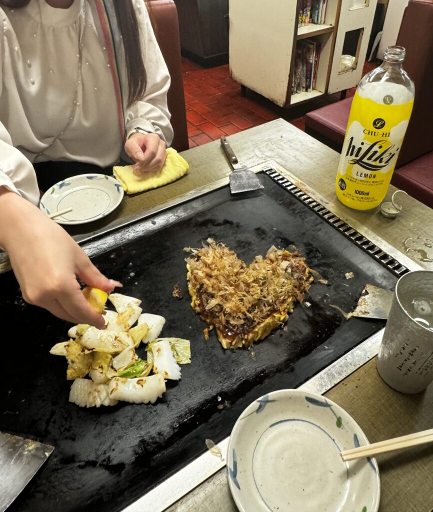 2人で1Lのチューハイを飲みながら、焼けるのを待ちます🎶名物の千草焼きは店員さんが焼いてくれるそうですがわたしたちは海老・いか・豚肉入りの「ちゃんぽん」を頼んだのでセルフです🍳