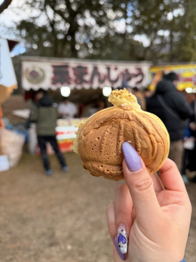 屋台で食べた栗まんじゅう、たい焼きみたいだけど薄皮の生地に餡たっぷりなのが